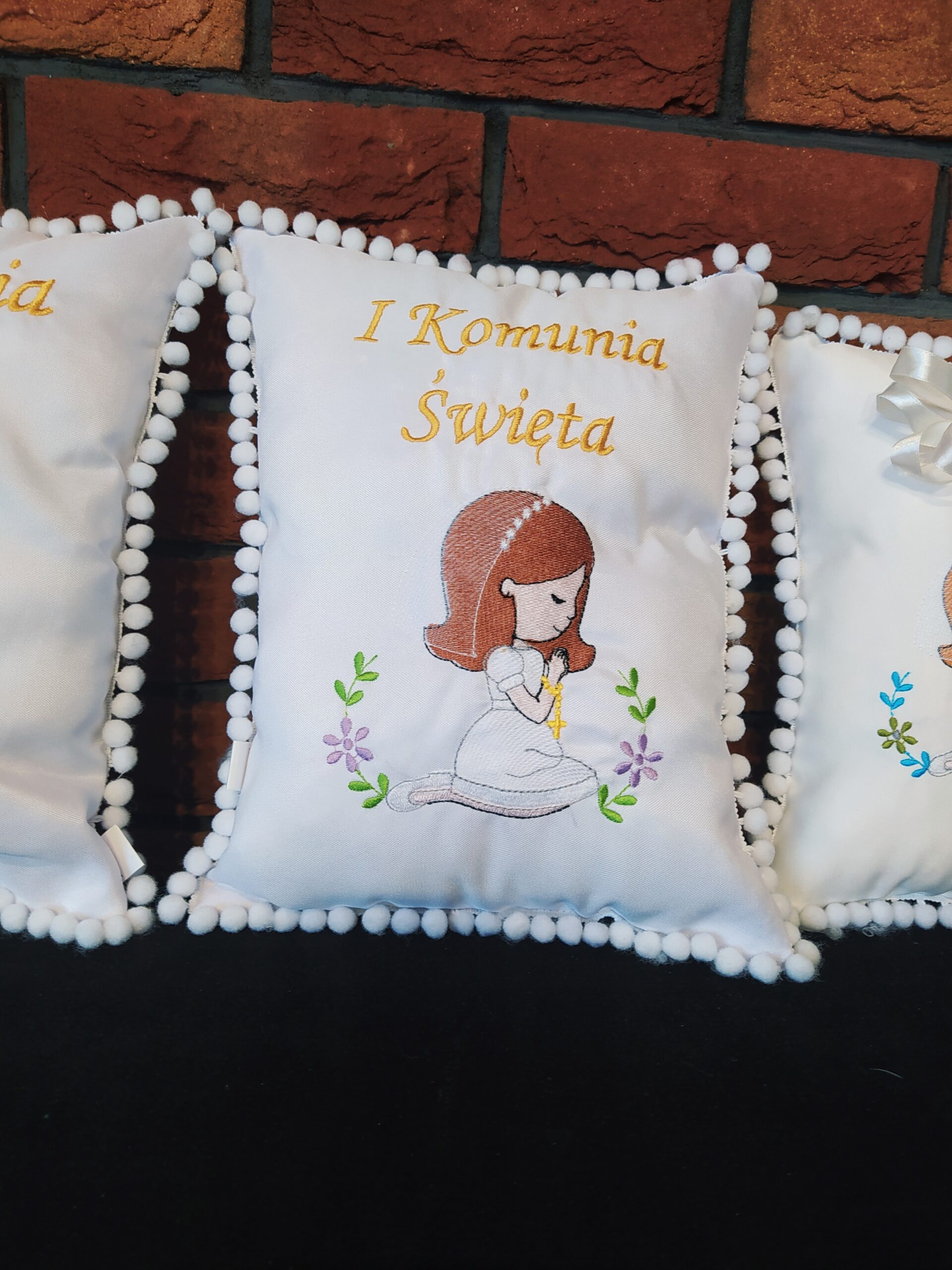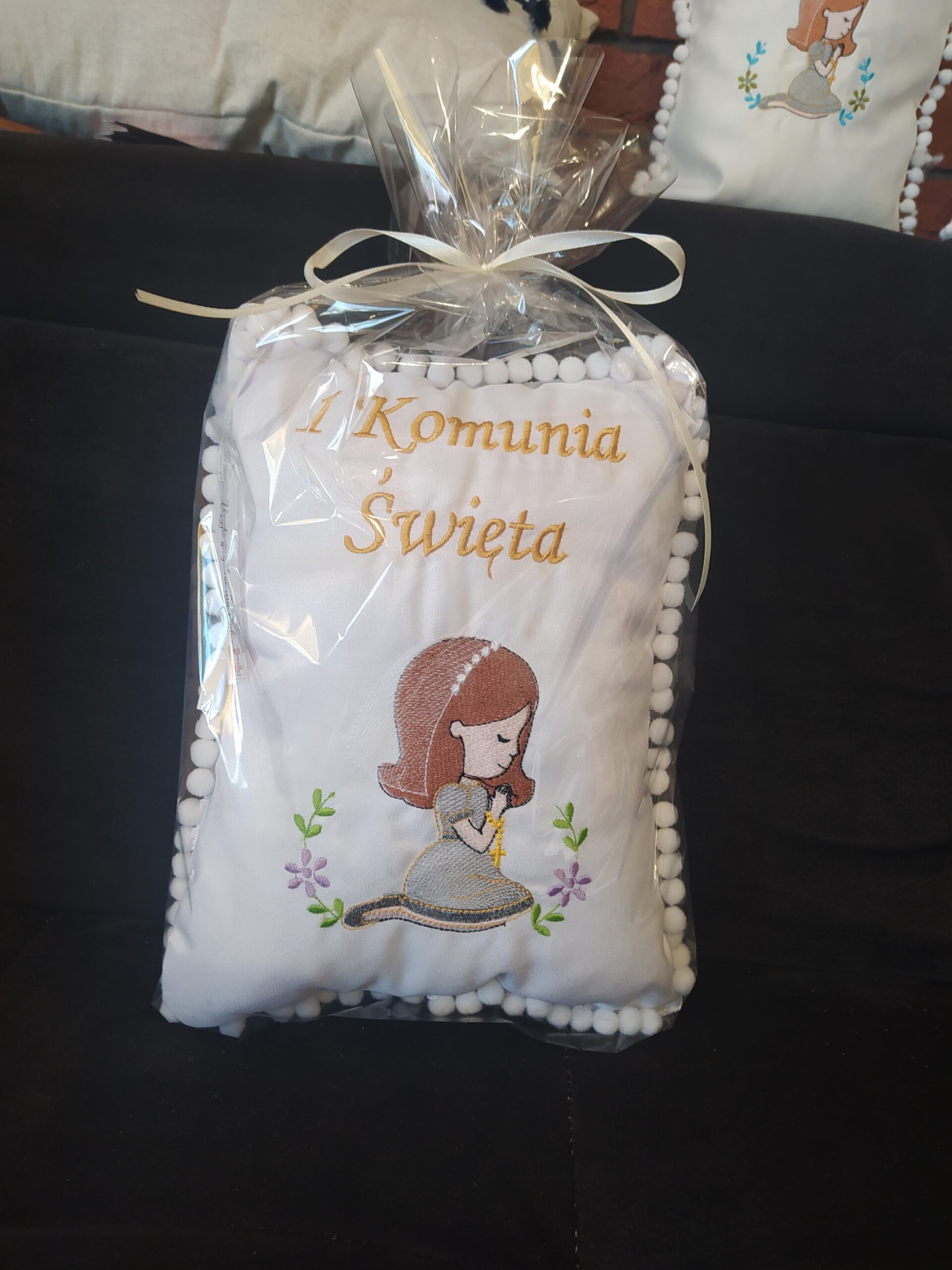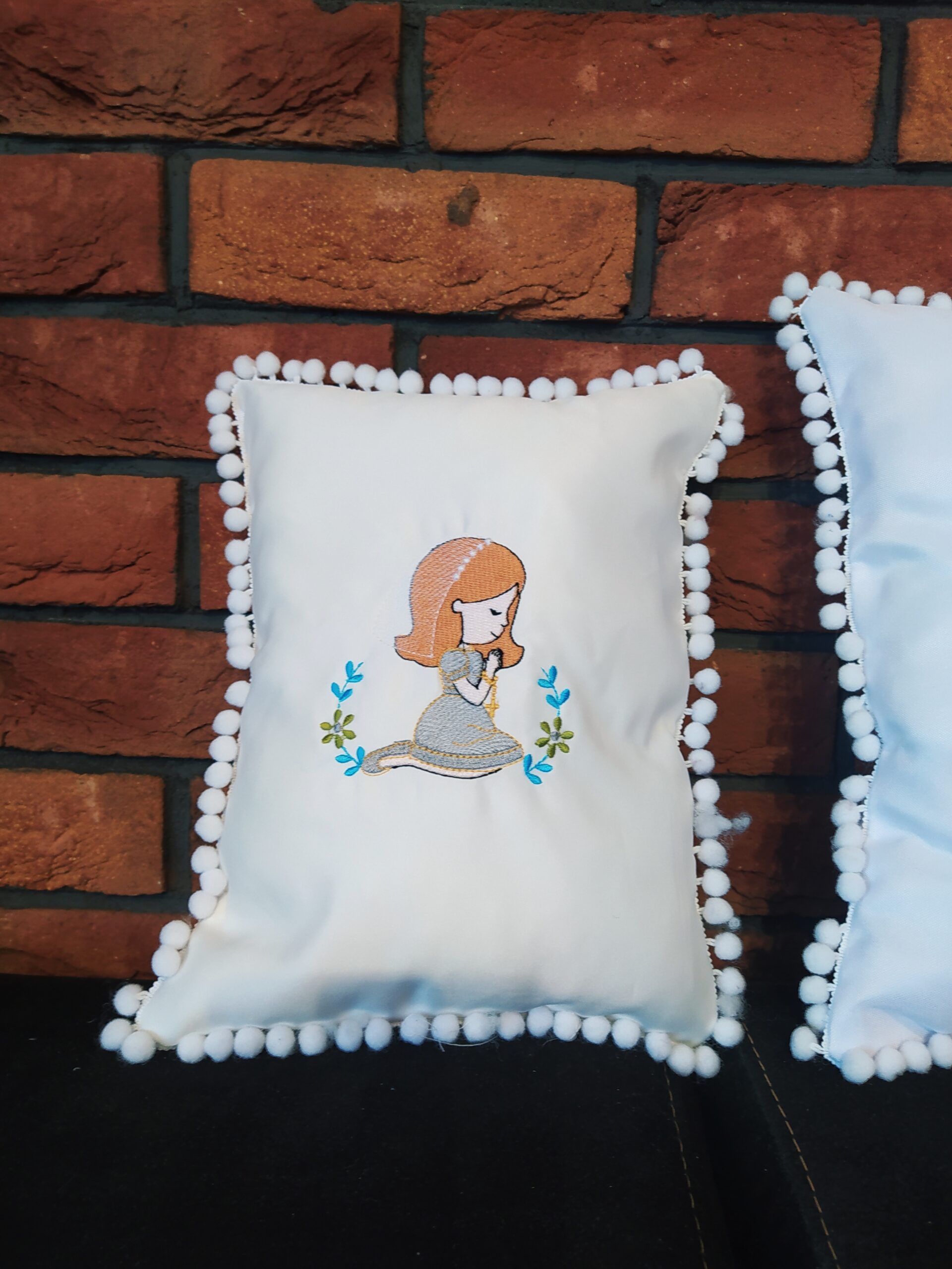 Starannie wykonany haft maszynowy , dodatkowo poduszka obszyta białymi pomponami.