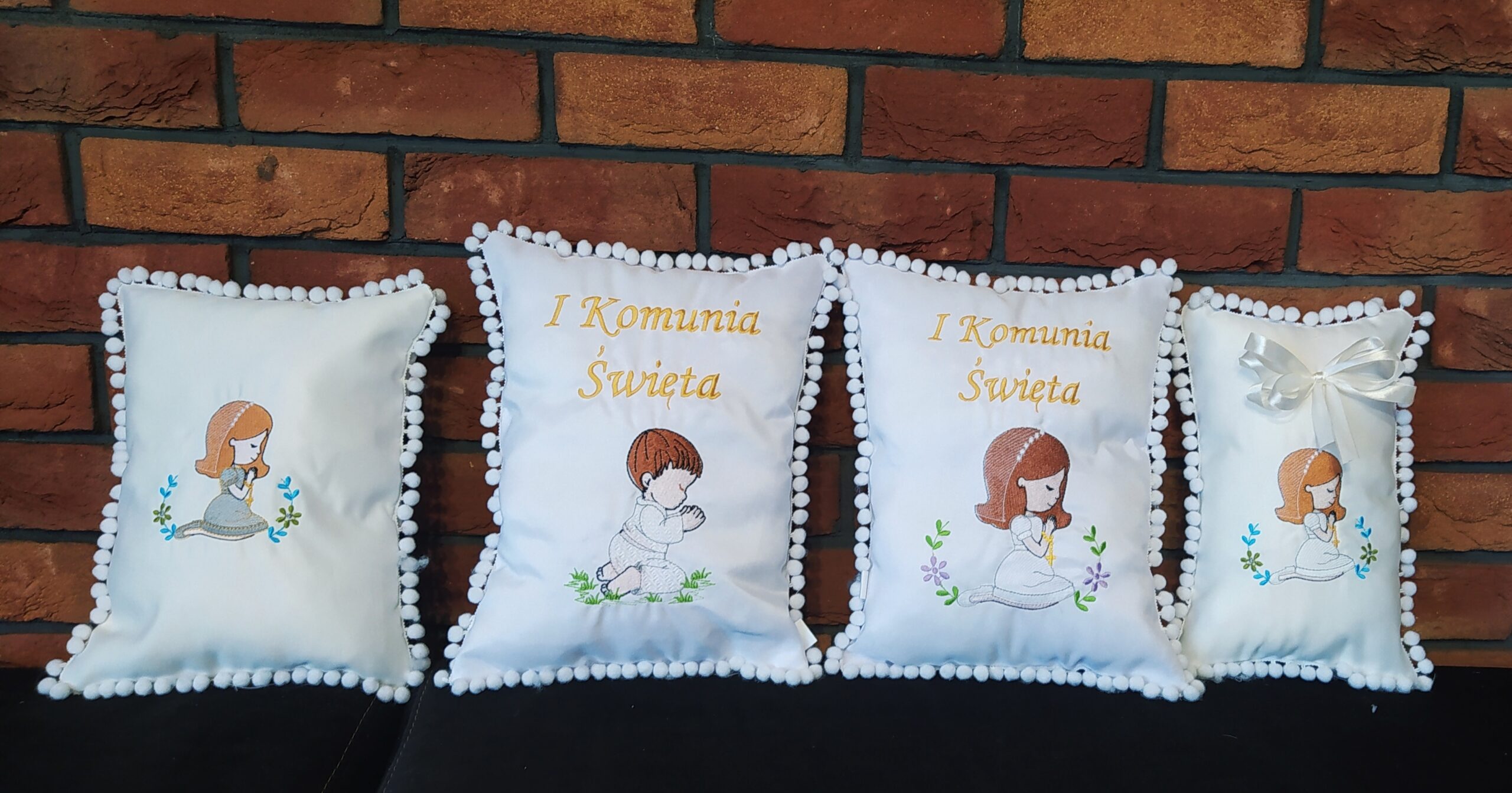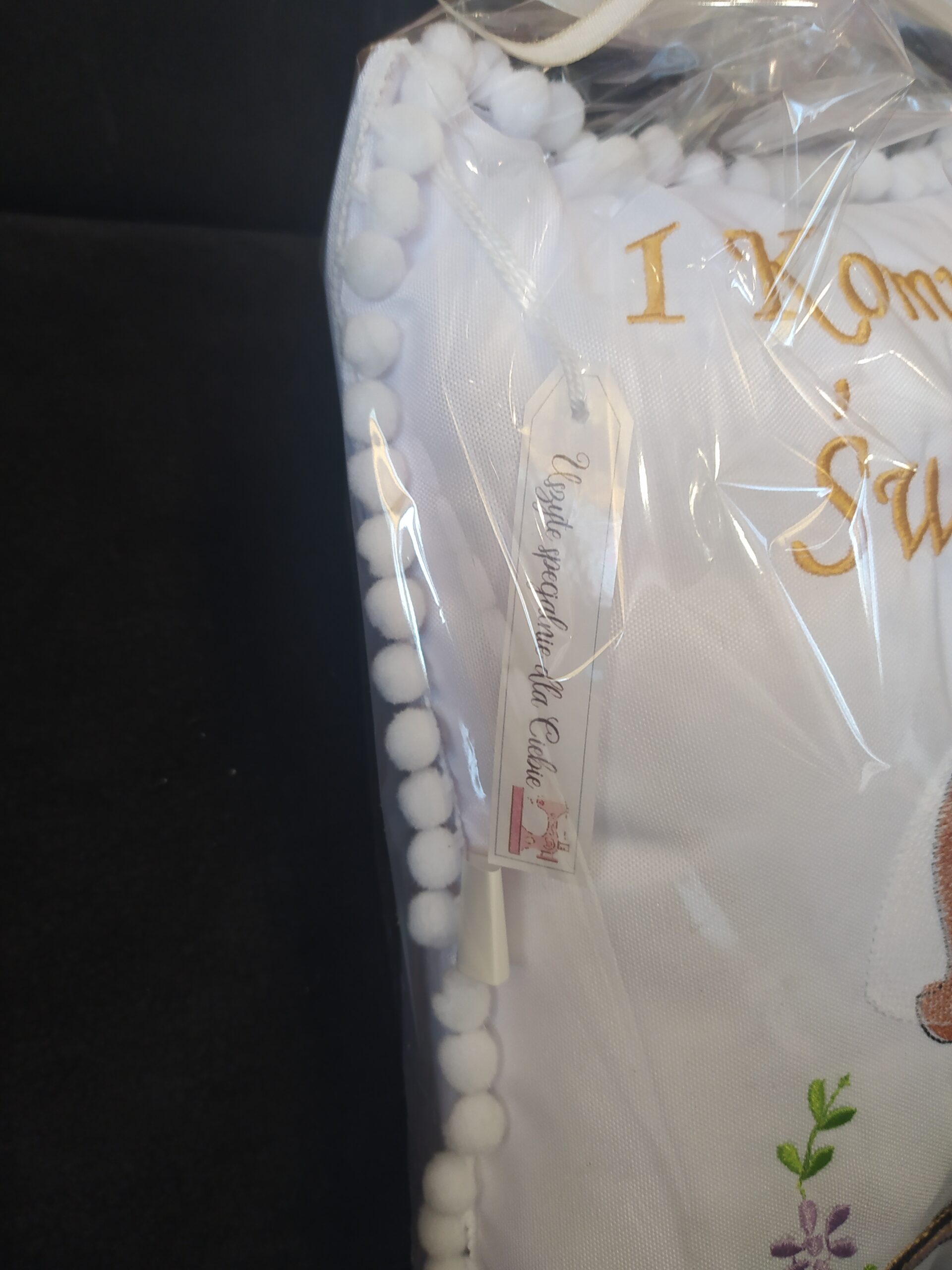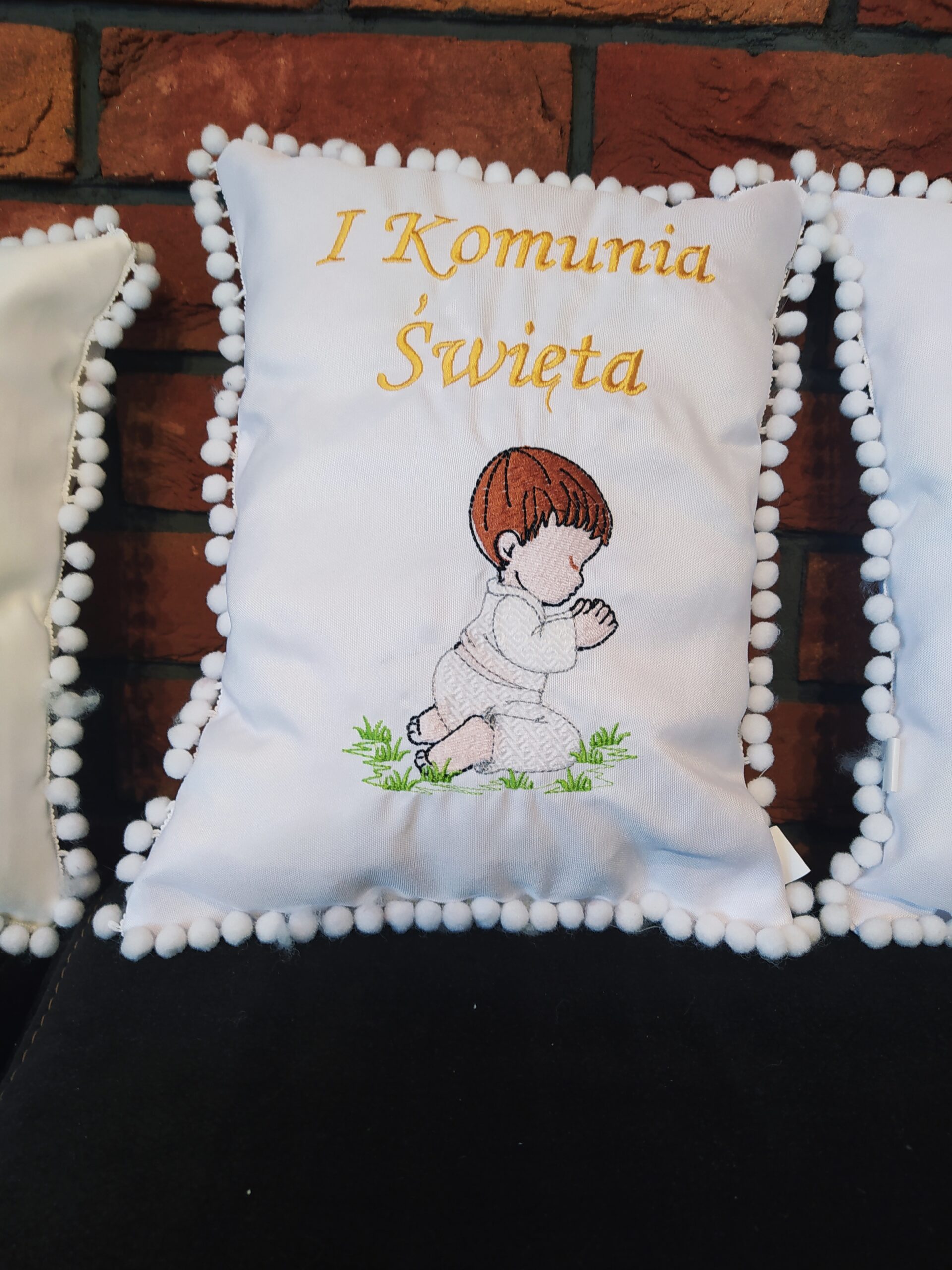 Starannie wykonany haft maszynowy , dodatkowo poduszka obszyta białymi pomponami.